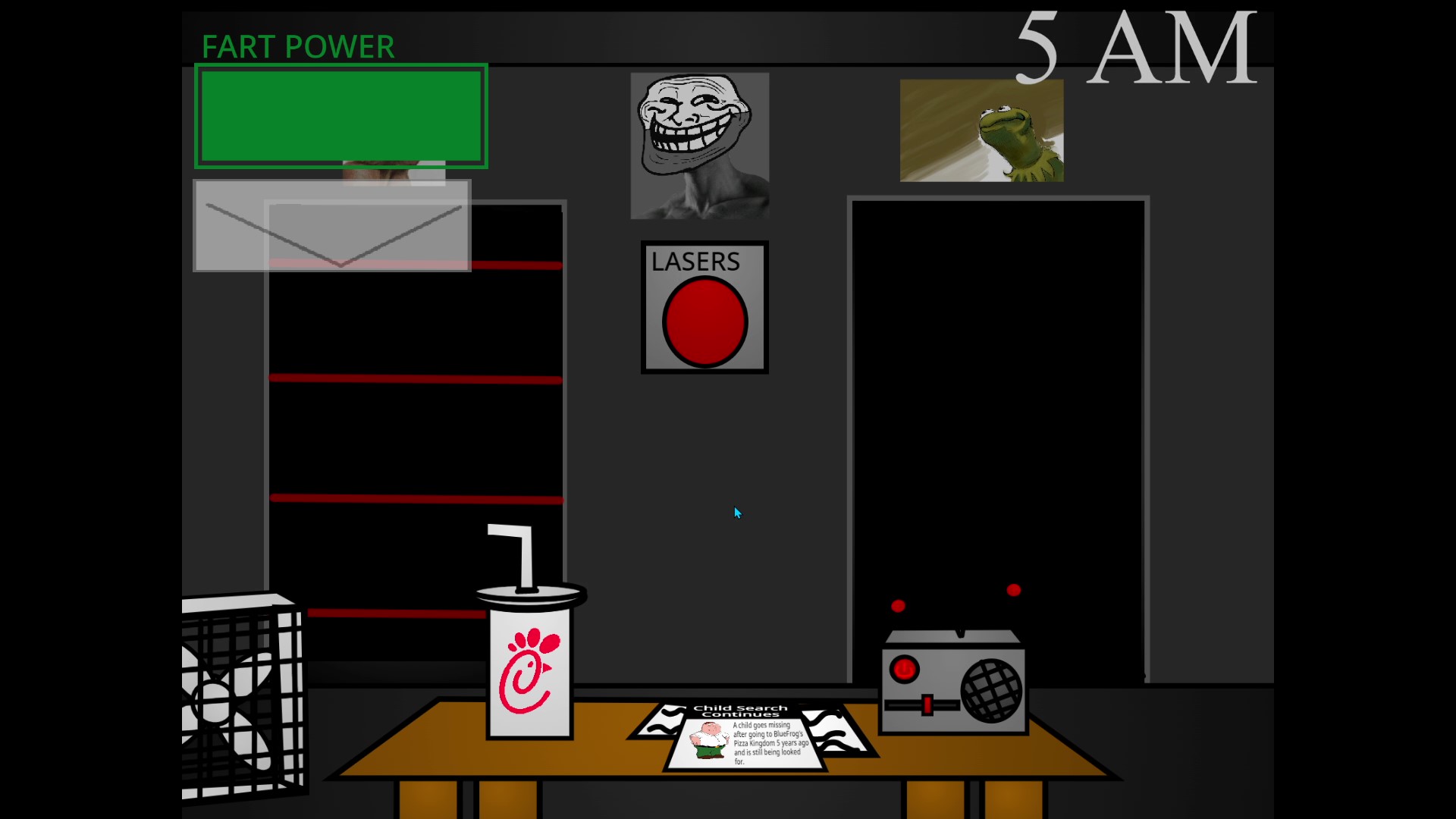 A YouTuber called Vsauce lived across the street from a local Chick-fil-A. He went there often. One night, he went outside and discovered they had added animatronics to the restaurant and he was like "o thats cool, i want." So later that night, after the building was closed, he broke in and stole the animatronics, later, his house was investigated and while they were investigating his house, the animatronics turned on, after that Vsauce woke up, and you are one of the only police left in the house, try to survive, i guess.
